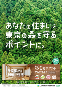 東京都は「東京の木 多摩産材」の需要拡大を図るため、多摩産材を一定量以上使用した住宅を新築及び内装木質化(リフォーム)した方を対象に、使用した多摩産材及び国産木材の量に応じて、東京の特産物等の贈呈品と交換できるポイントを交付しています。