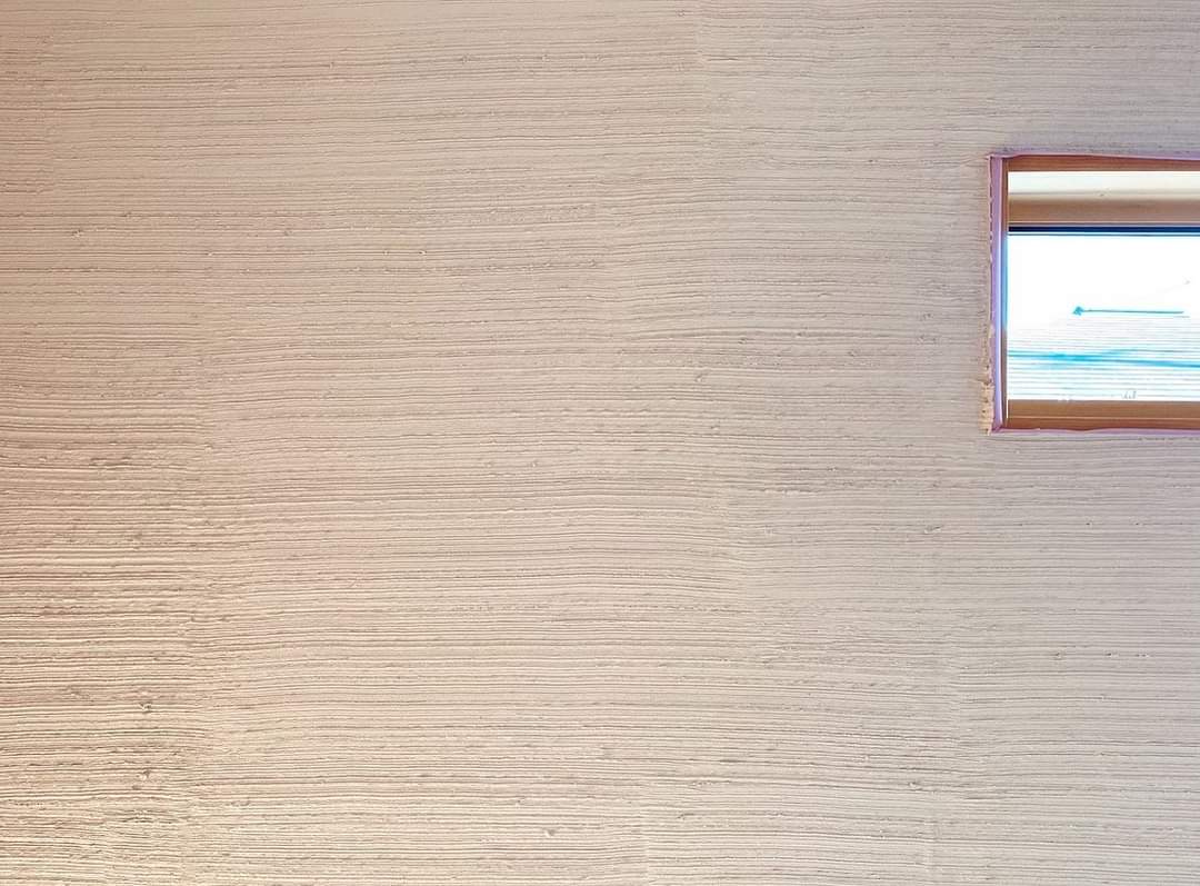 左官屋さんがシラス壁を塗る工事。専用の刷毛でテクスチャーを付けている様子です。