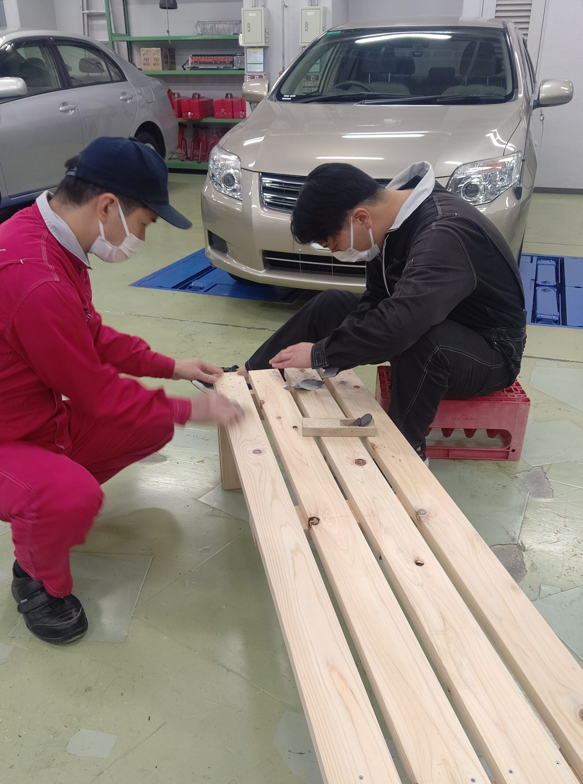 一級自動車整備士を目指す学生の皆さんと、多摩産材がコラボ。作業場はもちろん自動車整備の実習室です。